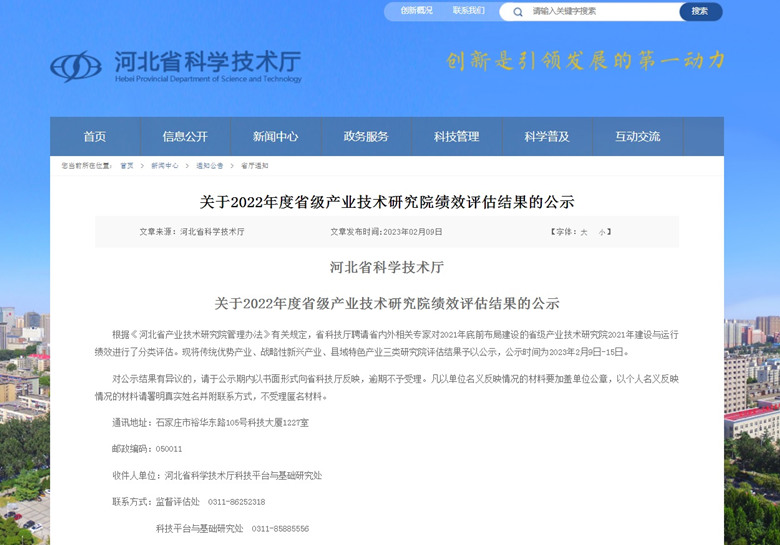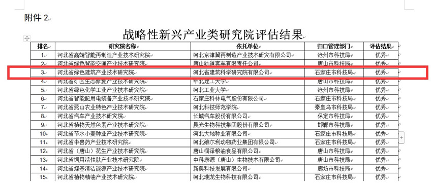 2023年2月9日,河北省科技廳發(fā)布了關(guān)于2022年度省級(jí)產(chǎn)業(yè)技術(shù)研究院績效評(píng)估結(jié)果的公示。經(jīng)評(píng)估,我公司建設(shè)運(yùn)行的“河北省綠色建筑產(chǎn)業(yè)技術(shù)研究院”榮獲戰(zhàn)略性新興產(chǎn)業(yè)類研究院優(yōu)秀等次。